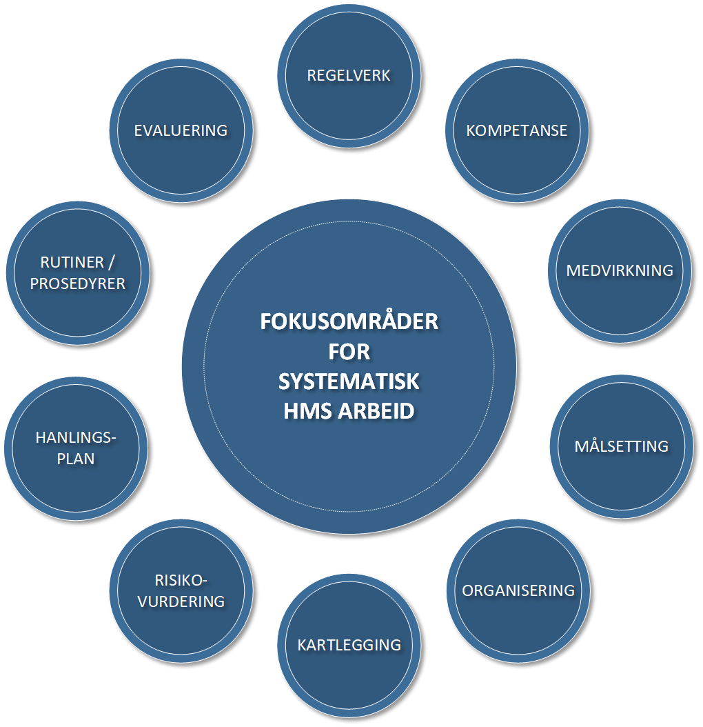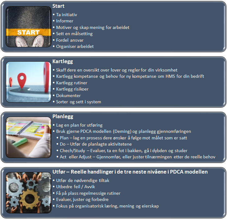 Uansett så er en godkjent tilbyder av bedriftshelsetjenester et godt utgangspunkt for å få på plass gode rutiner og strukturer rundt det lovpålagte og systematiske HMS arbeidet. Disse har fagmiljøer og/eller er tilknyttet andre ressurser som ofte kan bistå. Uansett er modellen under et godt utgangspunkt i tillegg til dette når en skal i gang med, eller revitalisere dette arbeidet: